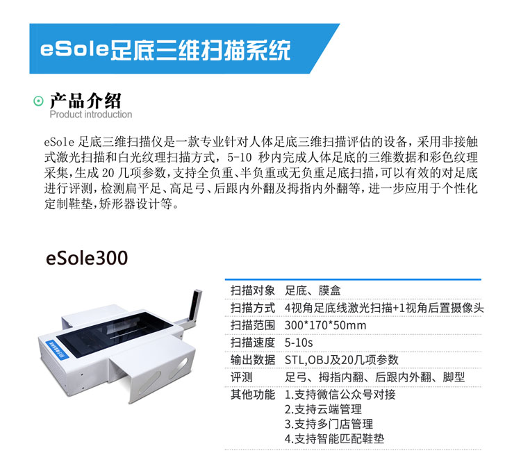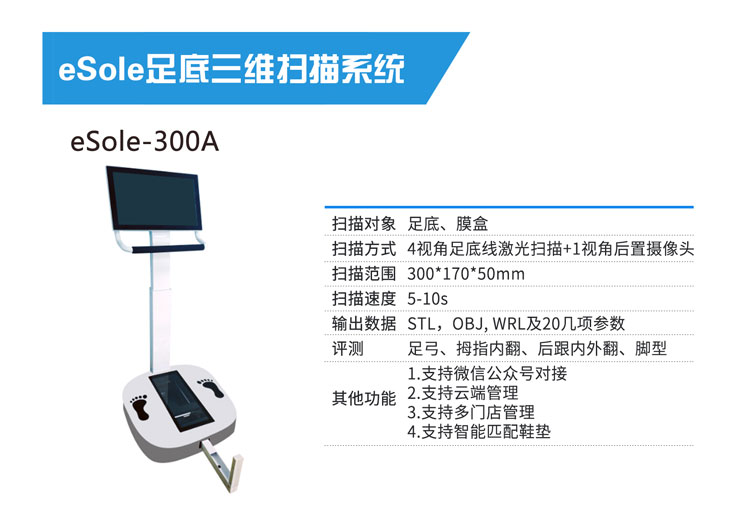 eSole足底三维扫描仪是一款专业针对人体足底三维扫描评估的设备,采用非接触式激光扫描和白光纹理扫描方式,5-10秒内完成人体足底的三维数据和彩色纹理采集,生成20几项参数,支持全负重、半负重或无负重足底扫描,可以有效的对足底进行评测,检测扁平足、高足弓、后跟内外翻及拇指内外翻等,进一步应用于个性化定制鞋垫,矫形器设计等。