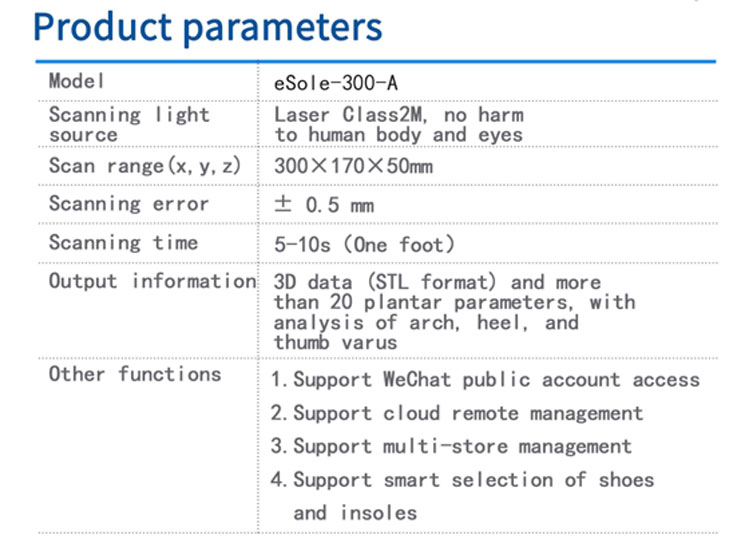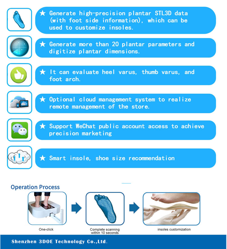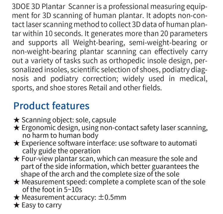 3D0E 3D Plantar Scanneris a professional measuring equip.ment for 3D scanning of human plantar. lt adopts non-con-tact laserscanningmethod to collect 3D data of human plan-tar within 10 seconds.lt generates more than 20 parametersand supports all Weight-bearing, semi-weight-bearing ornon-weight-bearing plantar scanning can effectively carryout a variety of tasks such as orthopedic insole design, per-sonalized insoles,scientific selection ofshoes, podiatry diag-nosis and podiatry correction;widely used in medical,sports, and shoe stores Retail and other fields.